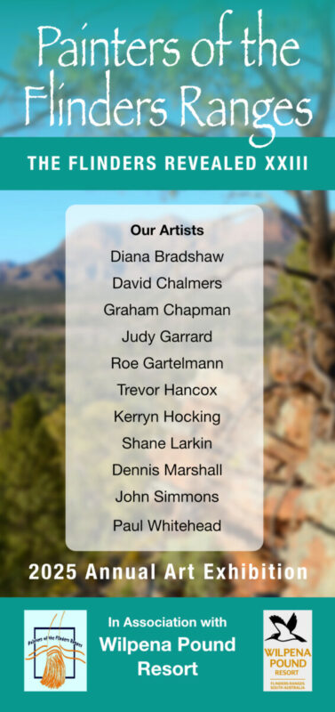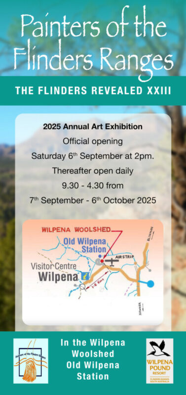 The annual 2025 Painters of the Flinders Ranges Art Exhibition, “The Flinders Revealed XXIII” will be held from Saturday 6th September until Monday 6th October in the Old Wilpena Woolshed. This year’s exhibition will be Officially Opened on Saturday 6th September at 2:00pm by Mr. Stephen Miller, General Manager of G’day Parks Wilpena Resort.
